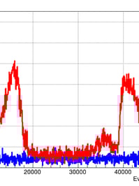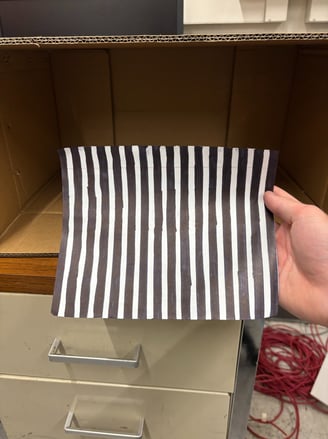 In order to do this I placed my light tight detector box with the detector inside, inside of another larger light tight cardboard box that was created to minimize the amount of photons that hit the detector from outside the LED light. Below is a larger prototype of the piece of paper that I used in front of the LED. Also, the graph shown below shows when the LED light is moved from black line to white, black, then to white again. This is shown with the spikes in the graph being the white, as more photons come in as opposed to black. In this experiment there is a lot of background photons that come from around the edges of the paper shown in the picture. This experiment shows the 1d representation of my experiment, and it is the stage that I am currently at.